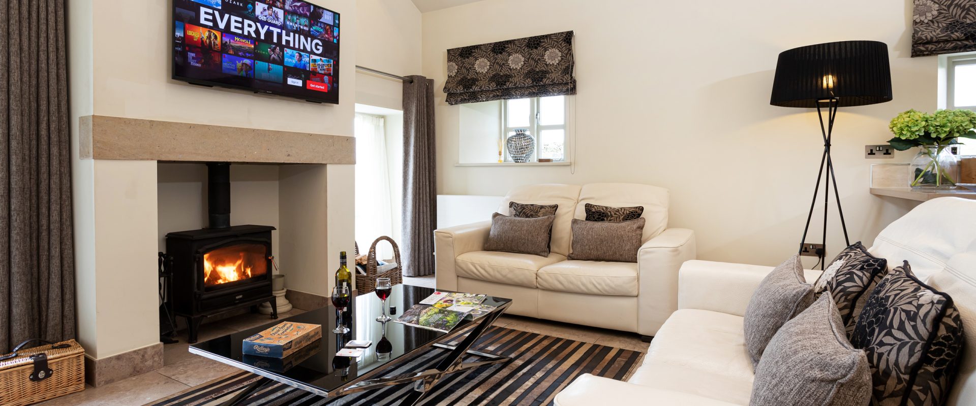 The sitting room has two comfortable leather sofas, and boasts a large flat screen TV with hyper fast wi-fi access available. A wood burning stove and underfloor heating keep the cottage warm all year round.