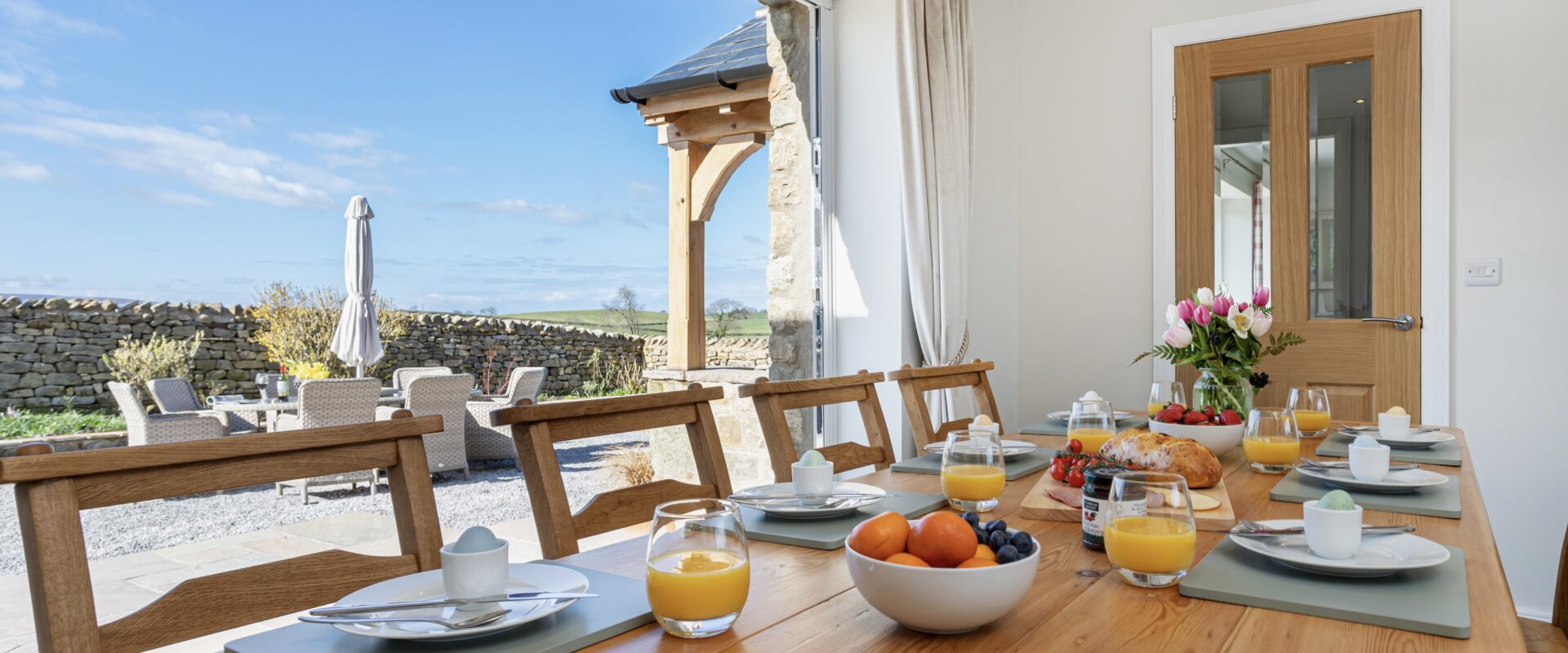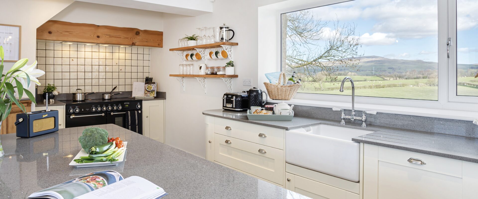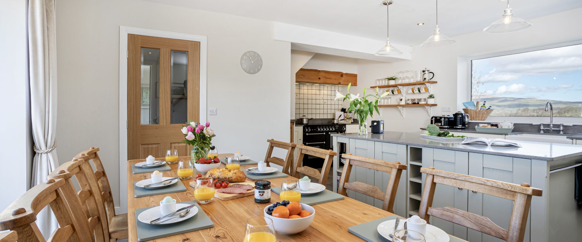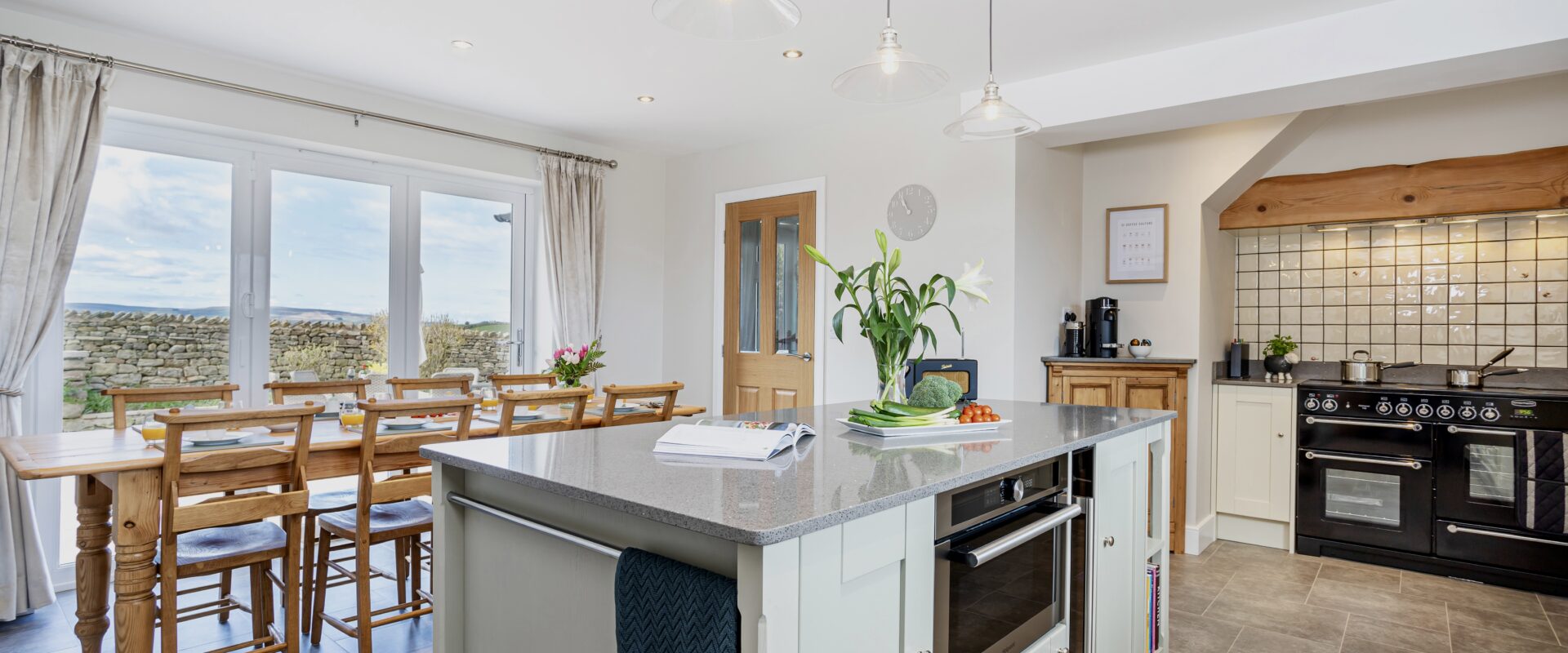 Leading off the entrance hall is a large living room with panoramic views over Yorkshire, Lancashire & Cumbria, there is an electric Aga log burner, smart TV and several games & books. The fully equipped kitchen is open plan with the dining space, this features a large antique farmhouse kitchen table. In the summer months you can enjoy opening up the bi-fold doors to offer an outdoor indoor living feel from the dining room. The kitchen leads onto another hallway with doors off to the boot room, downstairs bedroom, bathroom & a back door out onto the rear patio.