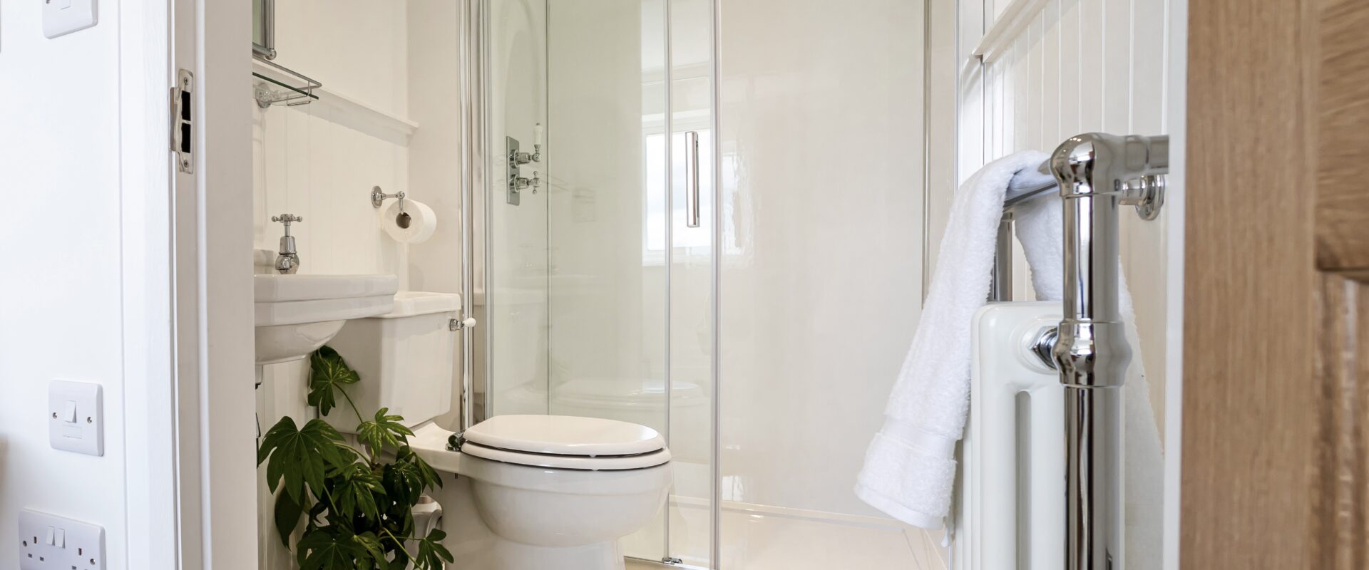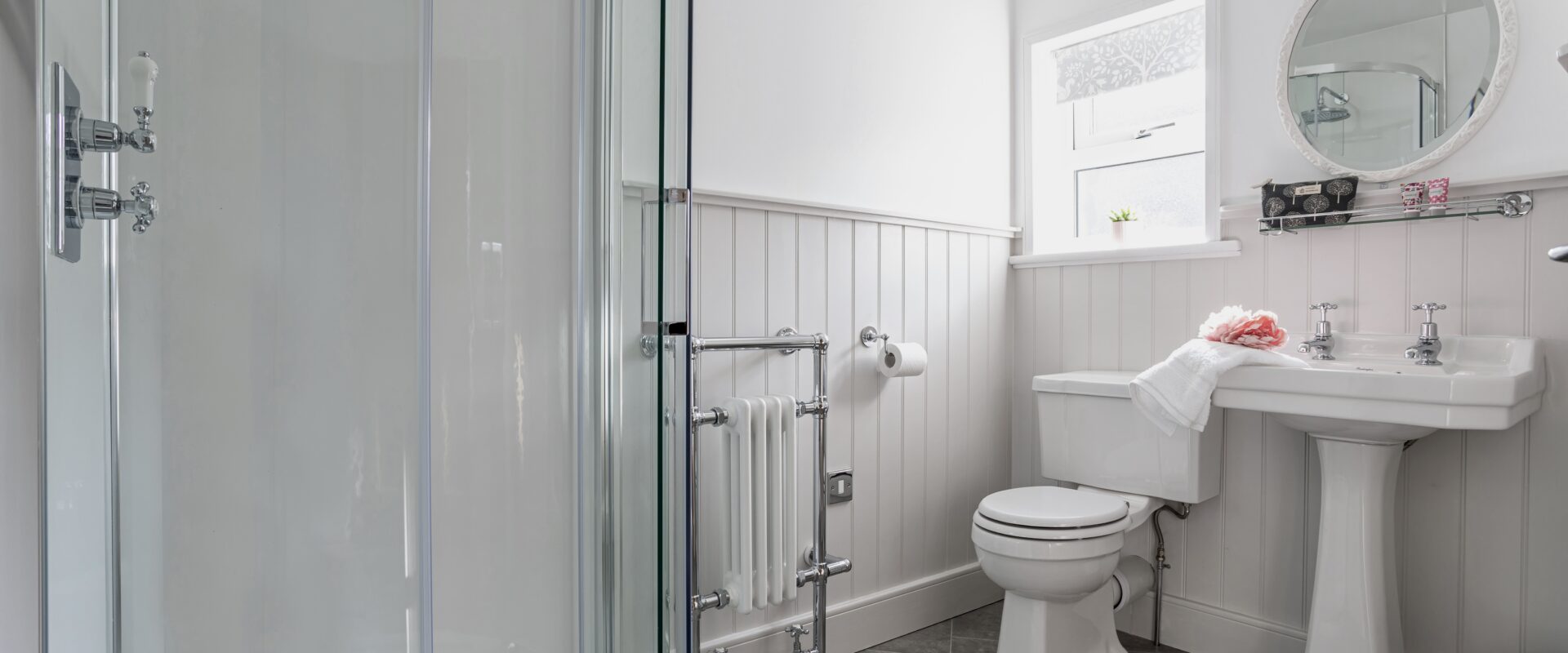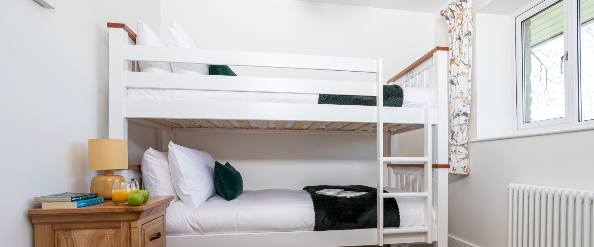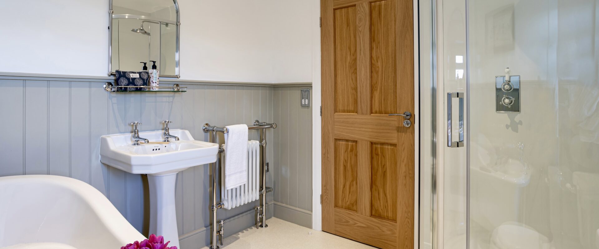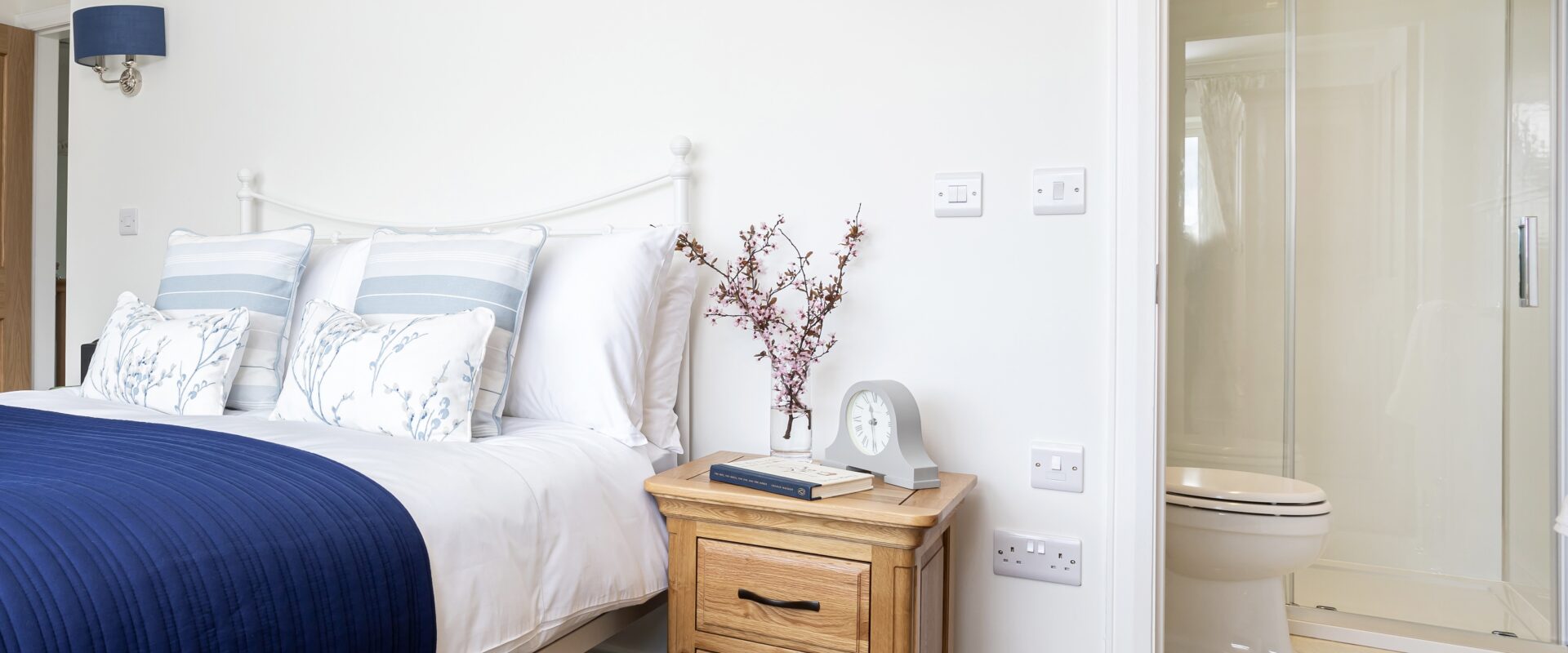 There is a spacious downstairs super king bedroom offering zip & link beds with the option of either twin room or super king and with it's own separate shower room next door. This ground floor bedroom along with the other main living areas in the house, make it perfect for guests who struggle with steps. The car park, gardens & patios around the house are also on a flat level, the only steps being the one into the house at each door & one down into the boot room.