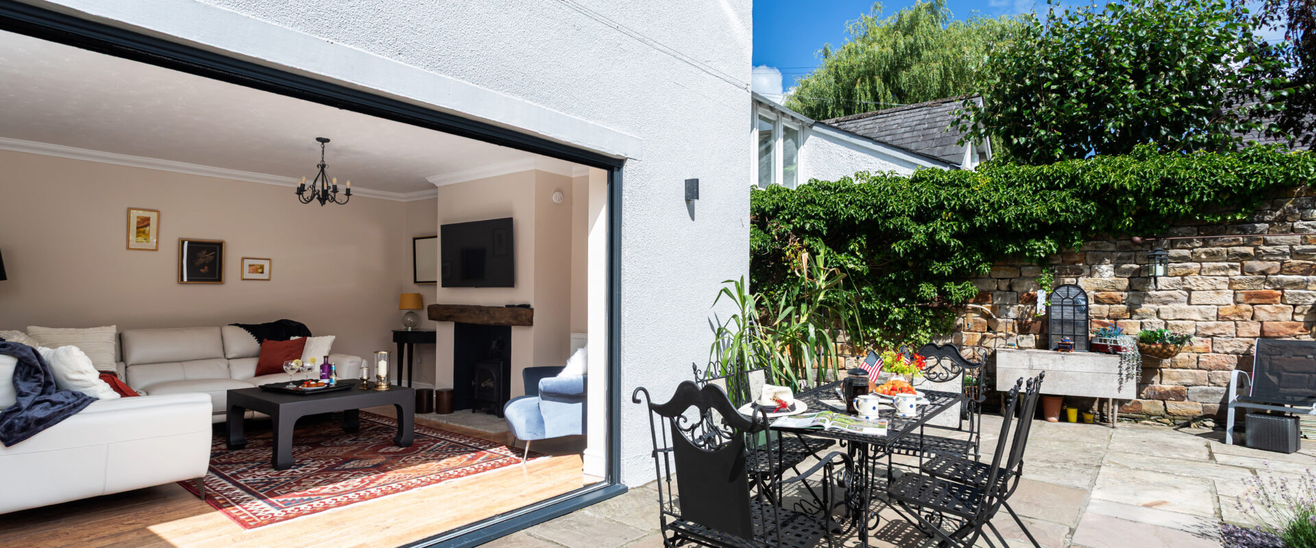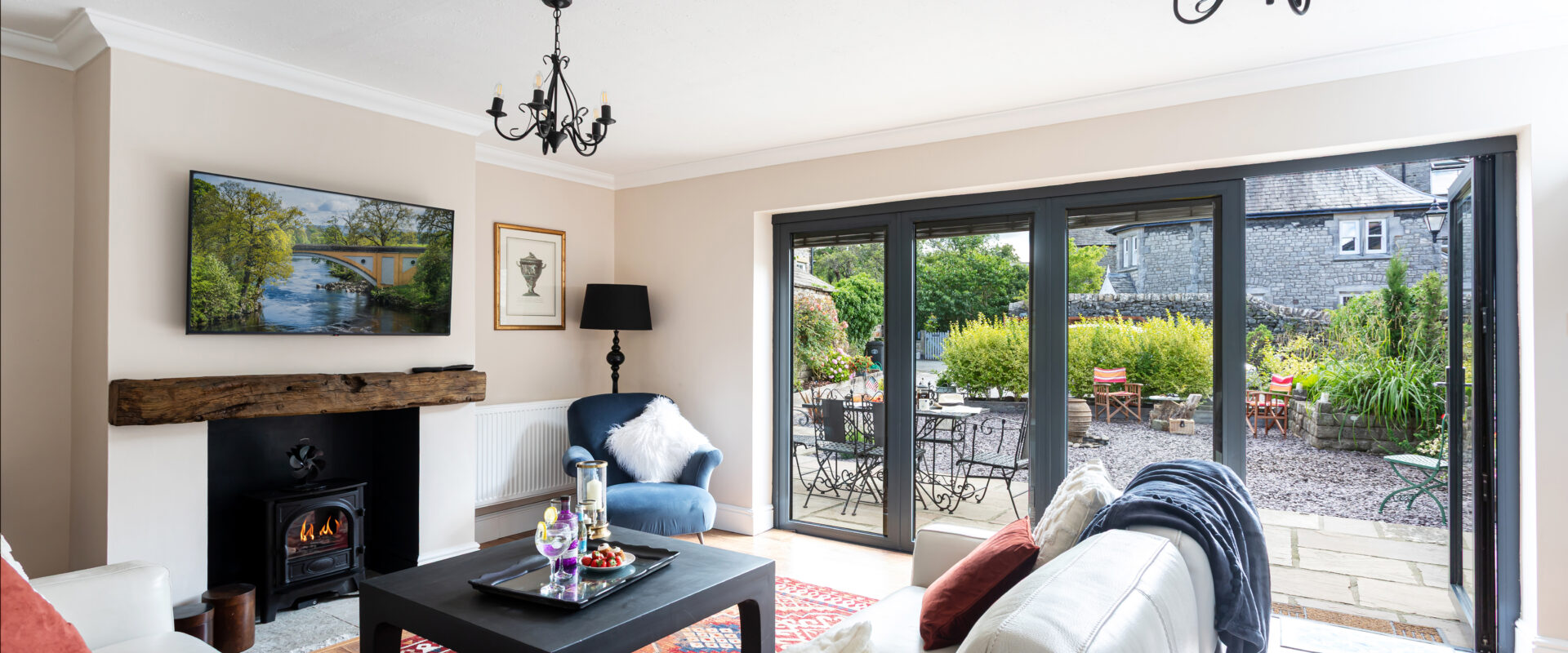 The contemporary kitchen is superbly appointed for seamless self-catering, flowing into a characterful dining space that blends charm with comfort. The stylish lounge boasts a smart TV, ambient gas fire, and expansive bi-fold doors that open onto a beautifully landscaped patio—perfect for relaxed indoor-outdoor living.