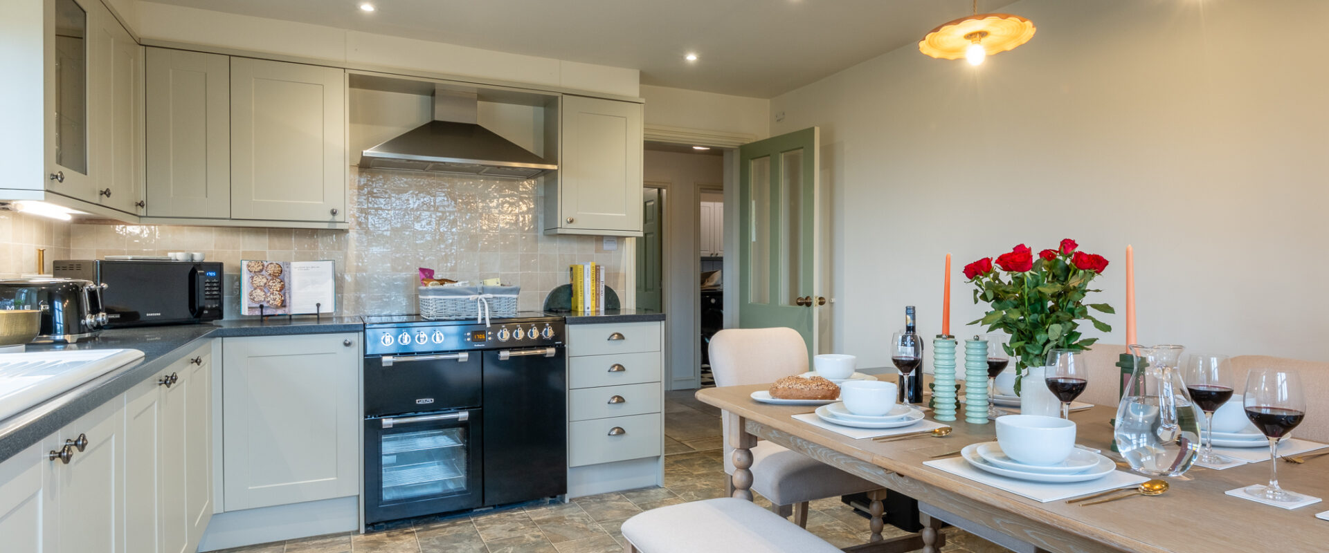 The ground floor of Sandstone 34 features a spacious lounge with a cosy log burner and smart TV, perfect for relaxing after a day outdoors. Adjacent is a fully equipped kitchen, ideal for preparing home-cooked meals and socialising with family or friends. The layout offers comfort, warmth, and easy flow throughout.