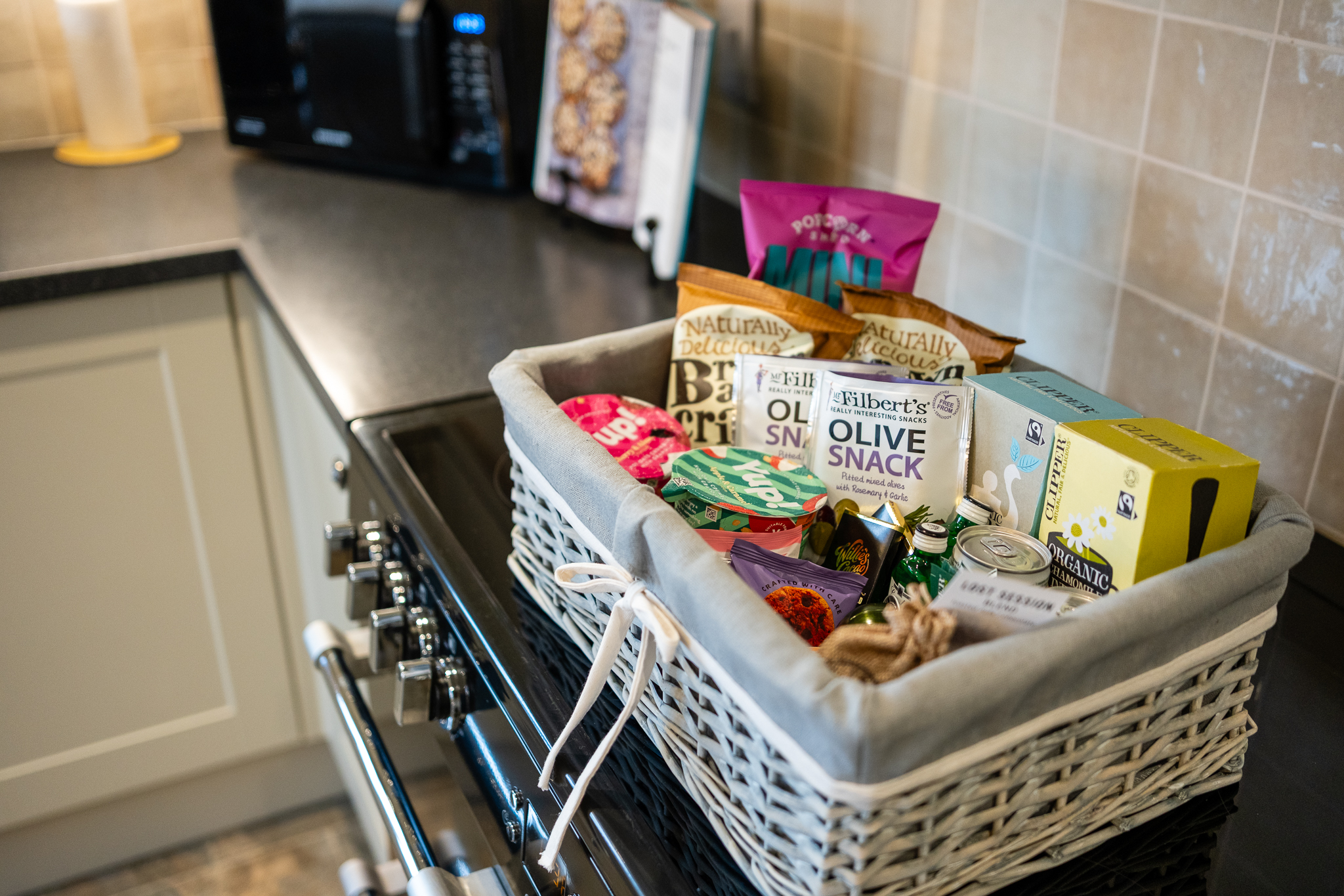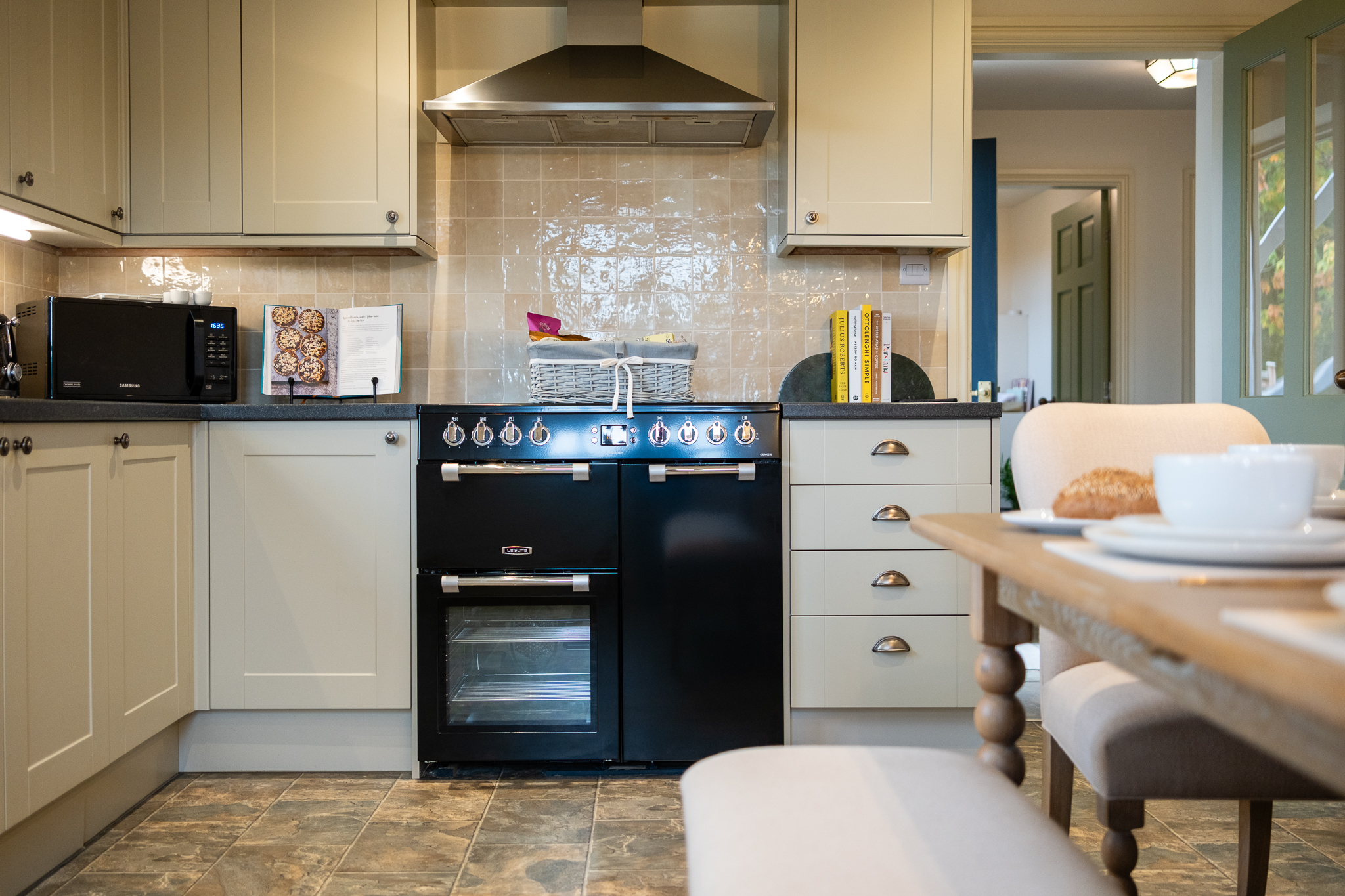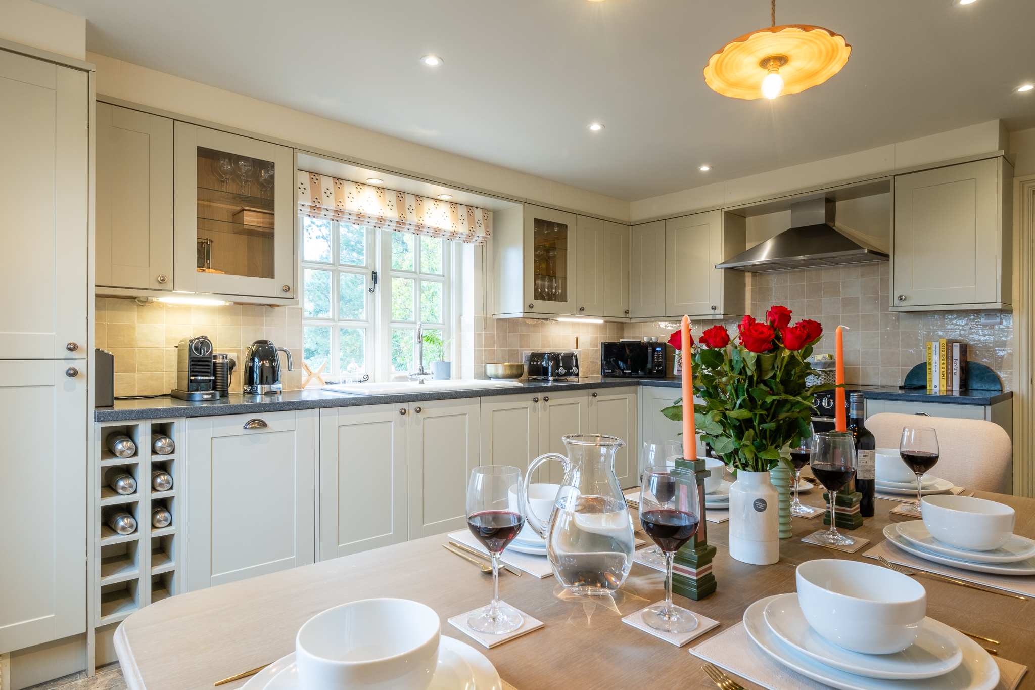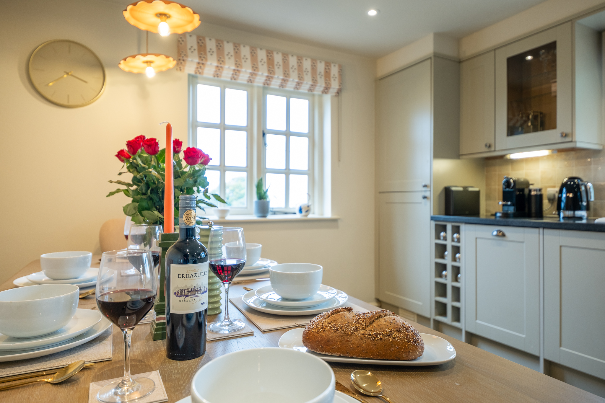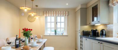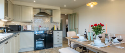 The ground floor of Sandstone features a spacious lounge with a cosy log burner and smart TV, perfect for relaxing after a day outdoors. Adjacent is a fully equipped kitchen, ideal for preparing home-cooked meals and socialising with family or friends. The layout offers comfort, warmth, and easy flow throughout
