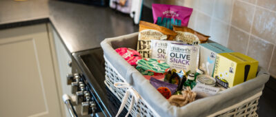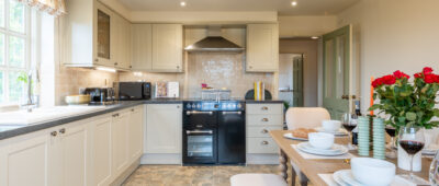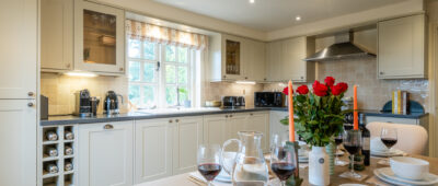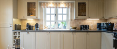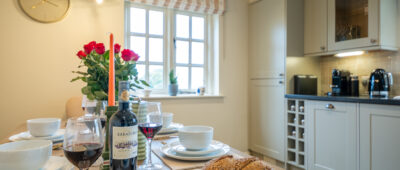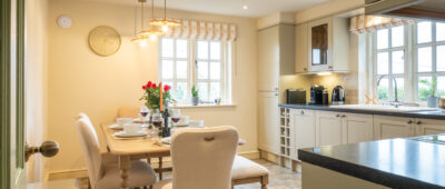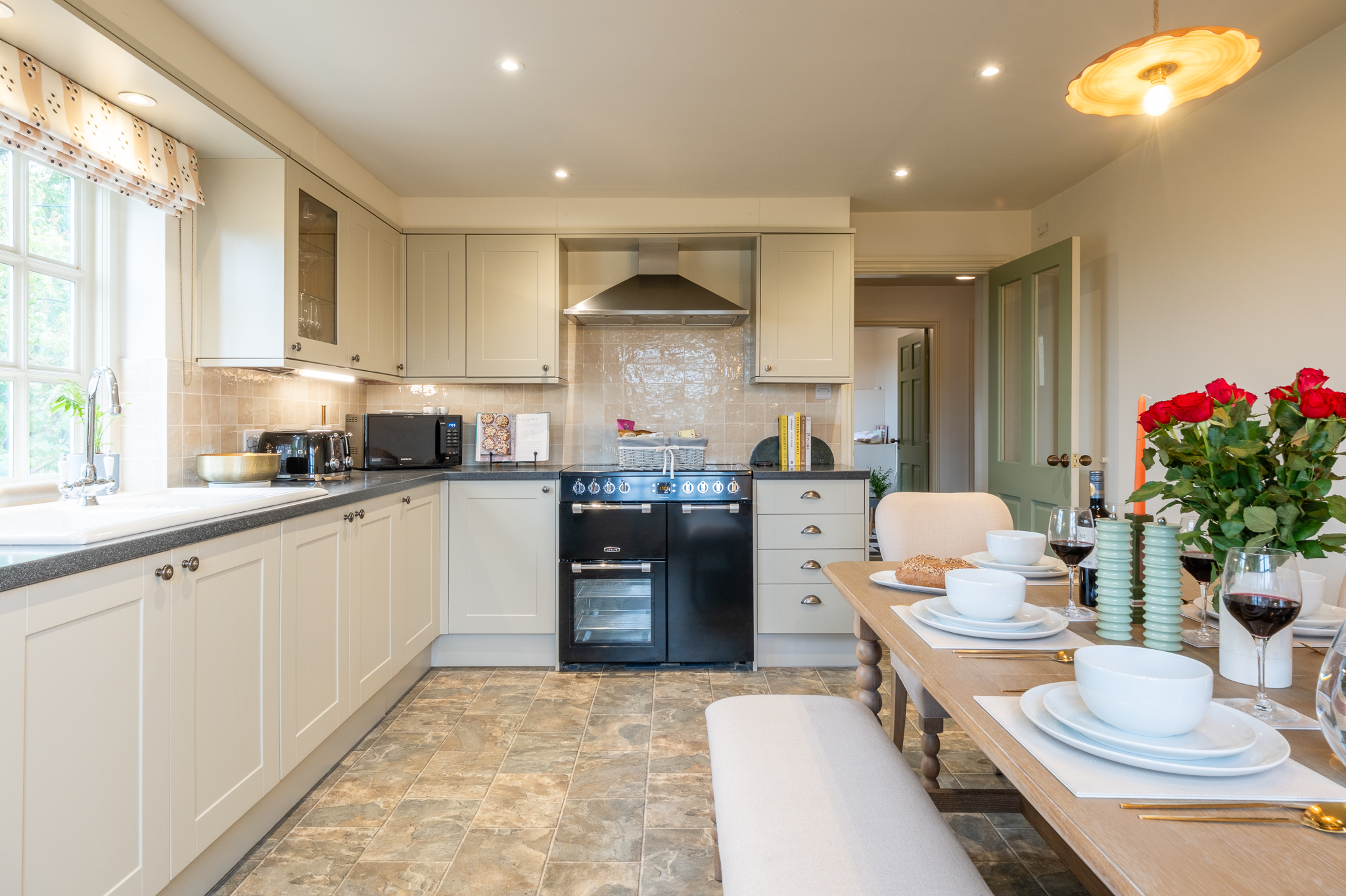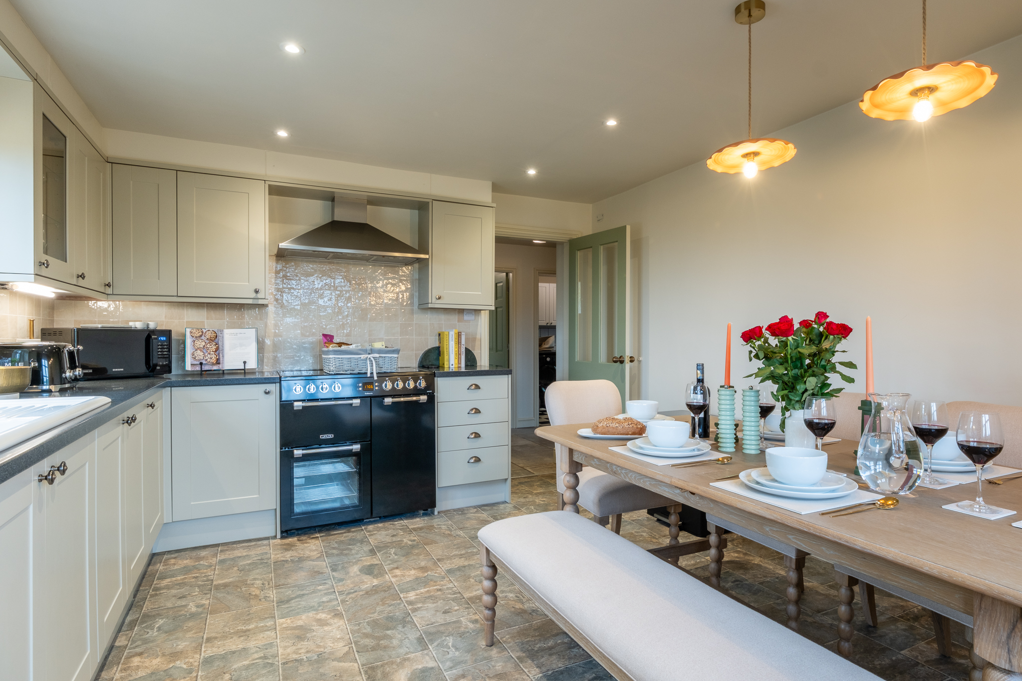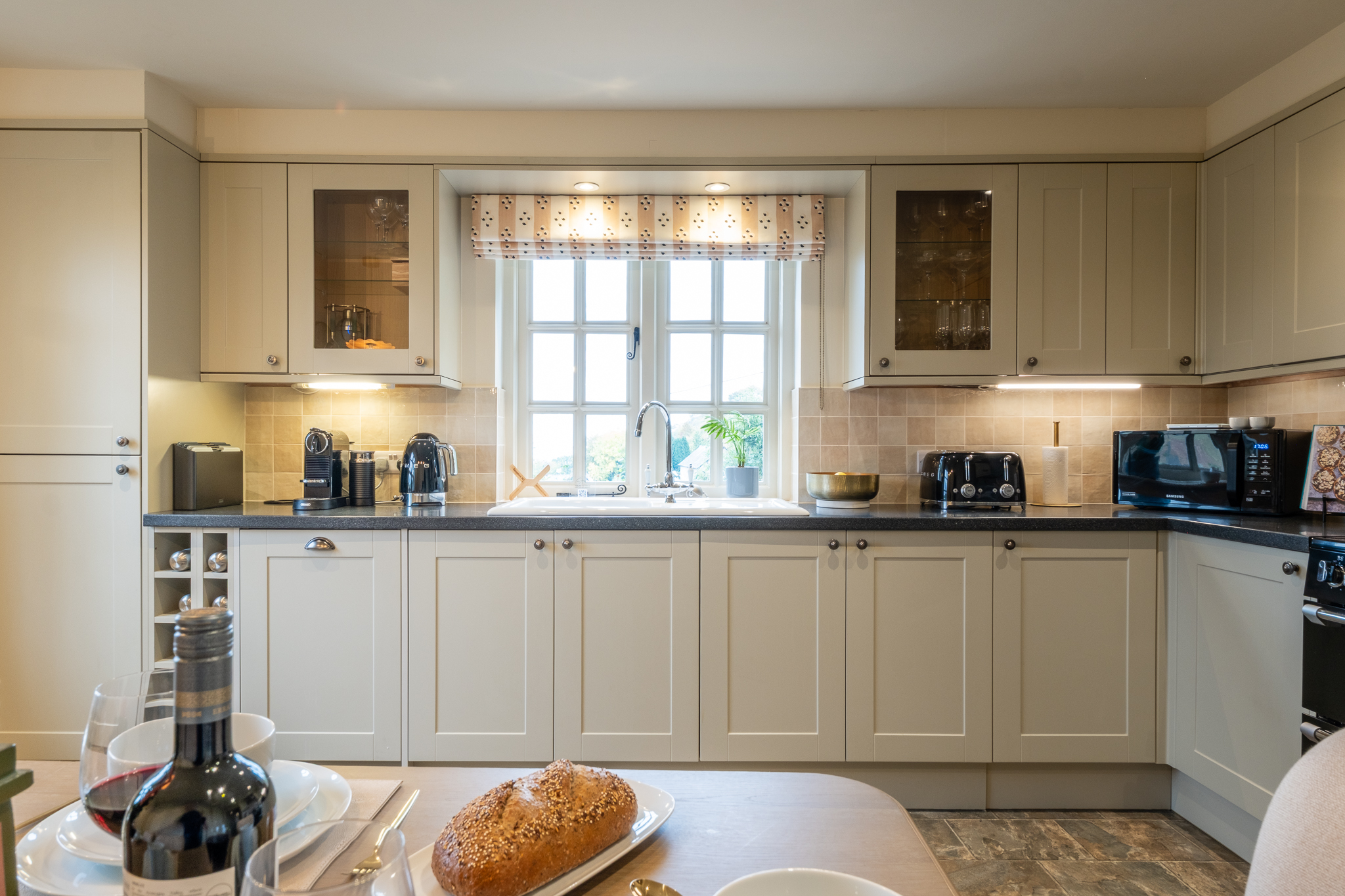 The ground floor of Sandstone features a spacious lounge with a cosy log burner and smart TV, perfect for relaxing after a day outdoors. Adjacent is a fully equipped kitchen, ideal for preparing home-cooked meals and socialising with family or friends. The layout offers comfort, warmth, and easy flow throughout