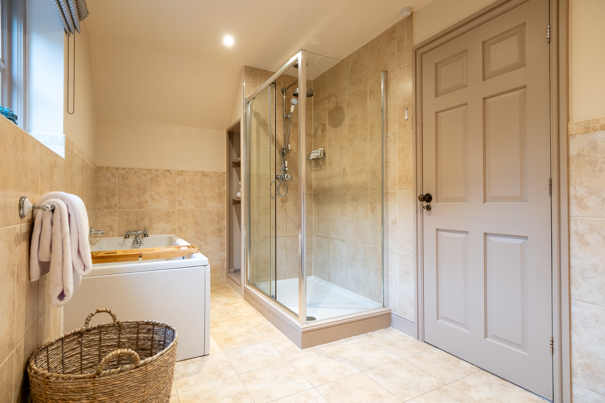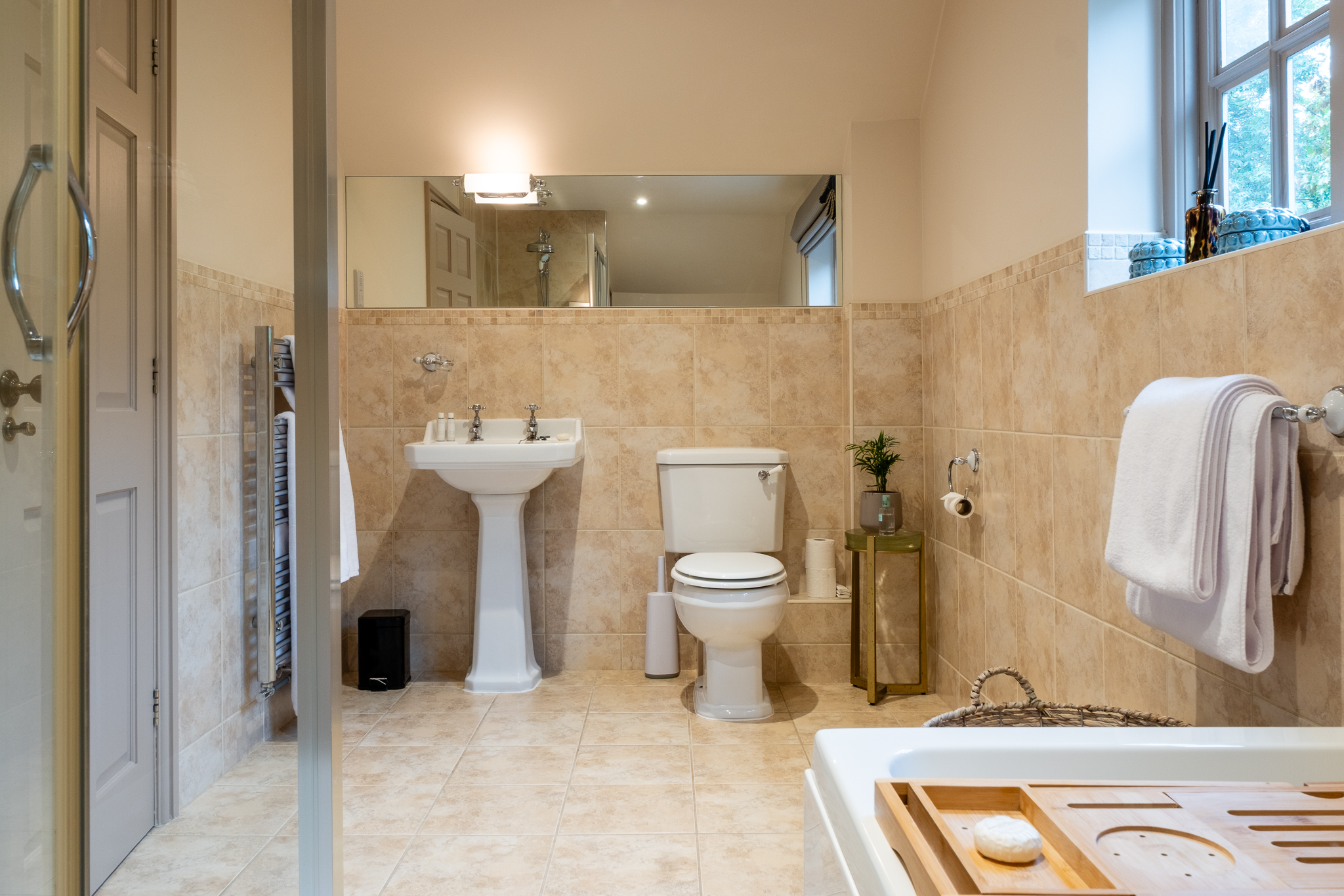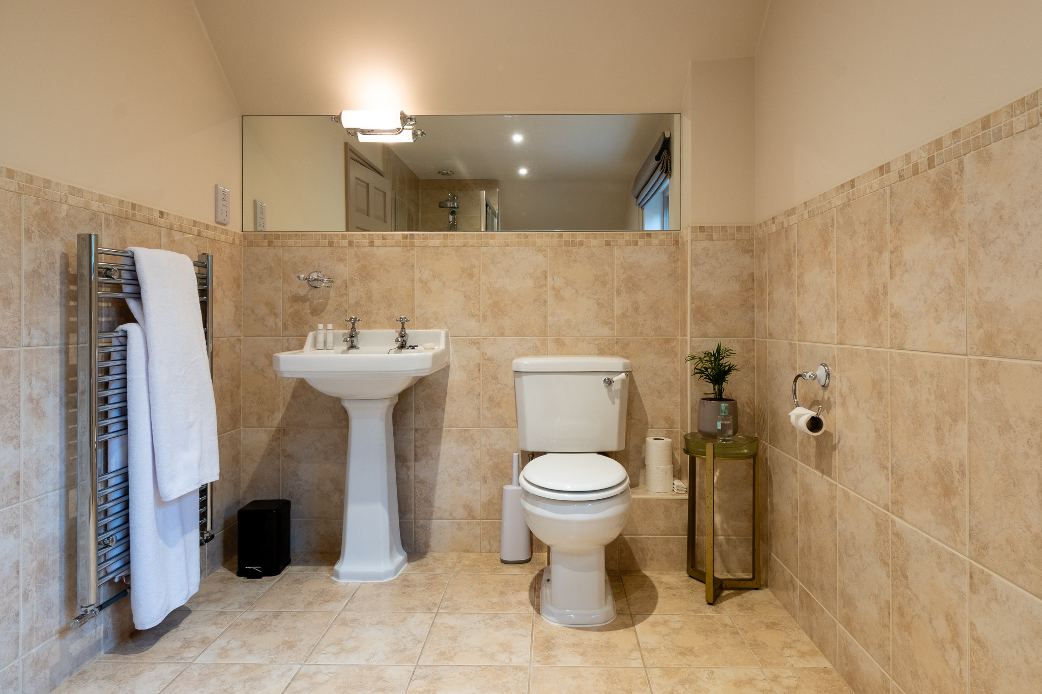 The first floor of Sandstone offers two king-size bedrooms and one twin bedroom, all thoughtfully furnished for comfort and relaxation. A spacious family bathroom with both a bath and shower completes the upstairs layout, providing a practical and peaceful space to unwind after a day exploring the countryside.