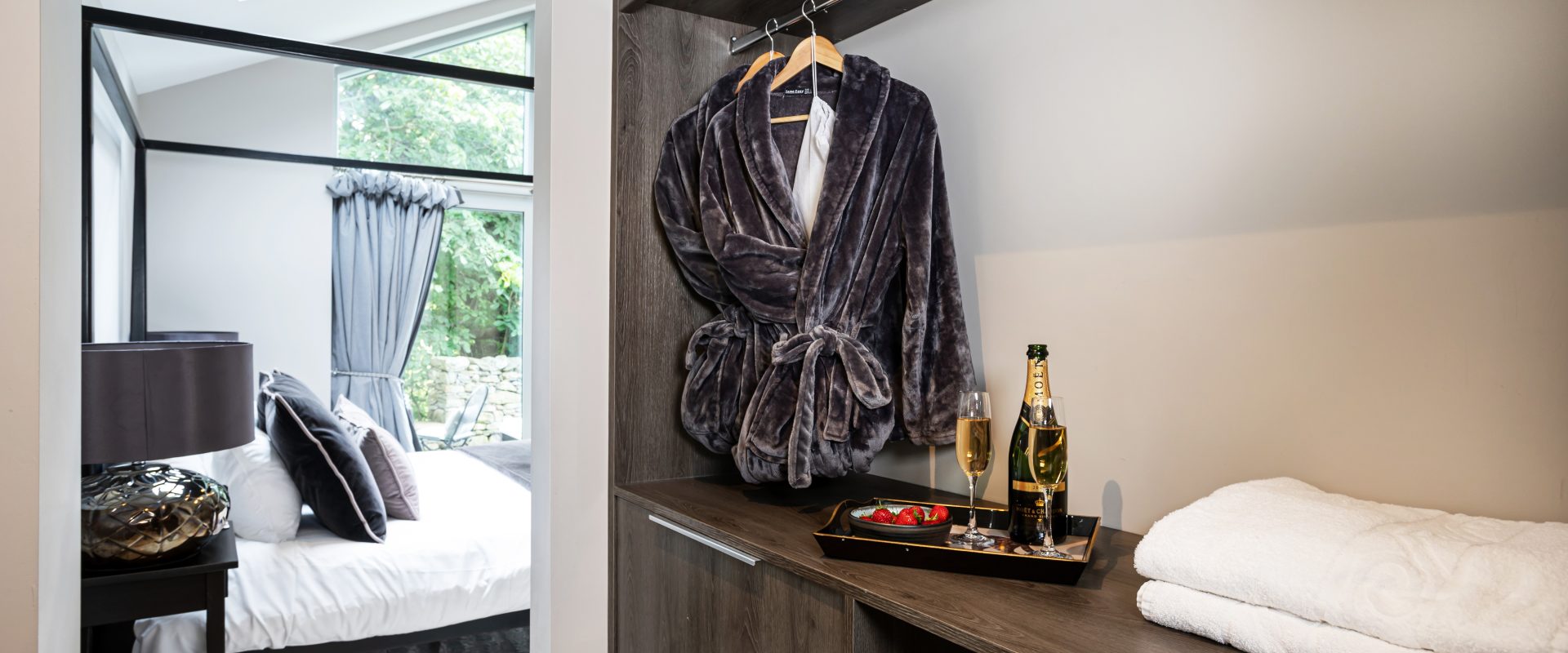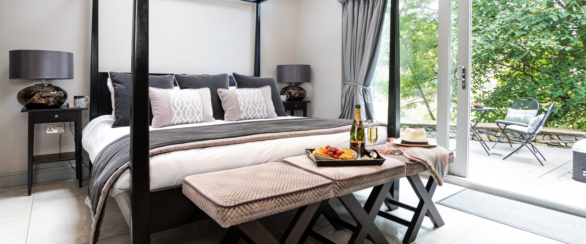 This 5 Star property enjoys a gorgeous bedroom suite with super-king four poster bed, dress room and en-suite shower room. Step out of the french windows onto your terrace complete with hot tub overlooking the waterfall and stream which flow through the grounds of the Mill House Estate.