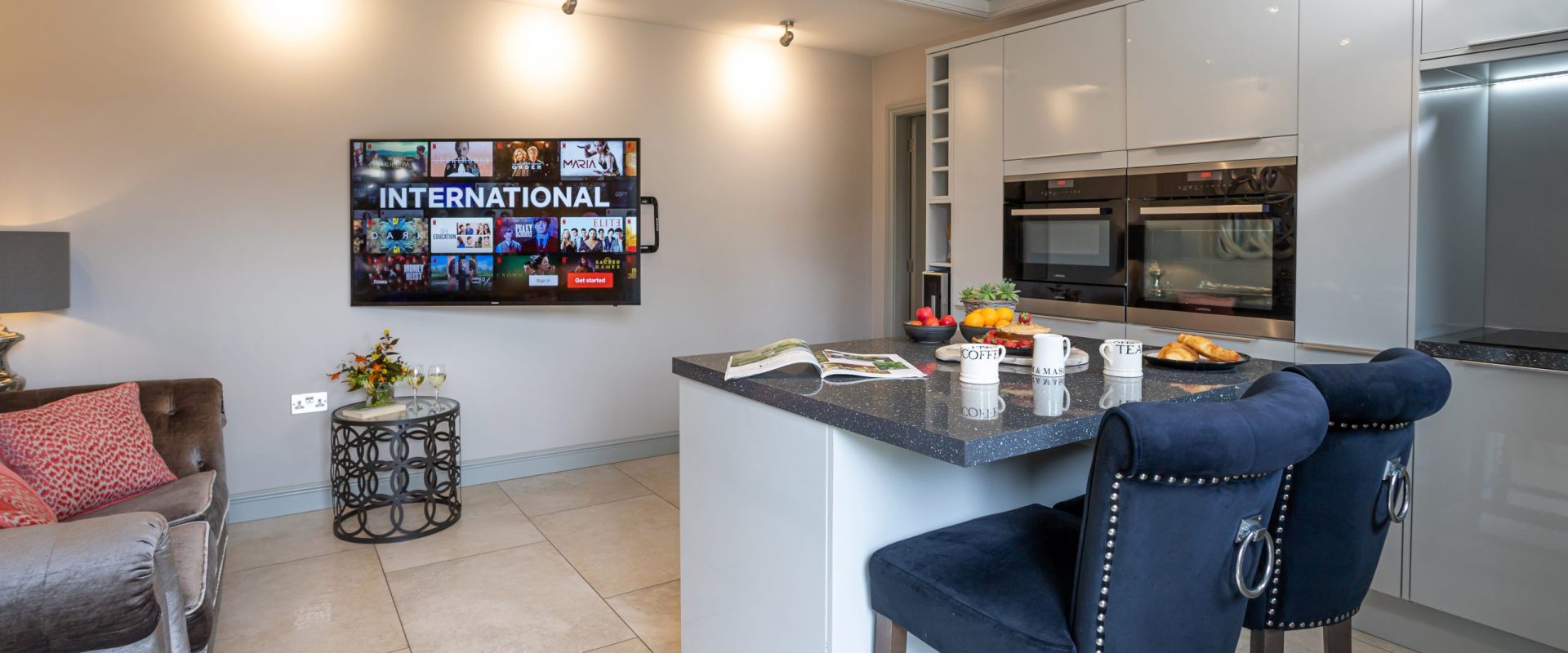 The open plan living area enjoys a huge wall mounted Smart TV, breakfast bar and kitchen. Preparation space is limited at The Cow Shed but the property does have an oven.ย There is also a fridge, dishwasher, Nespresso coffee machine and microwave.