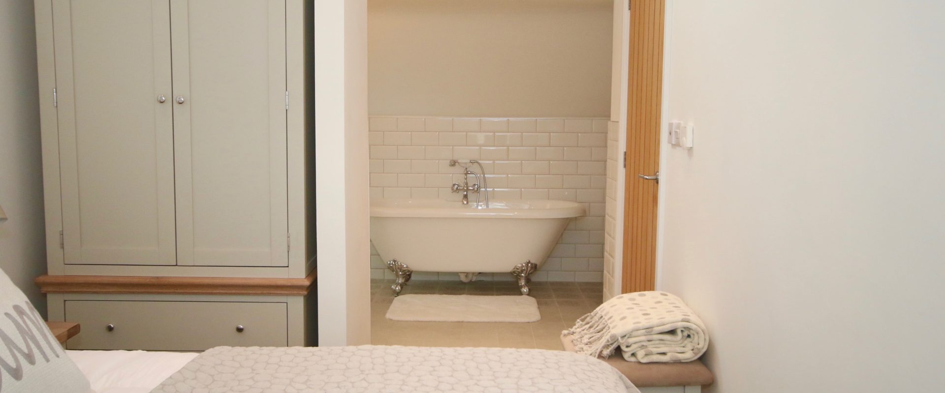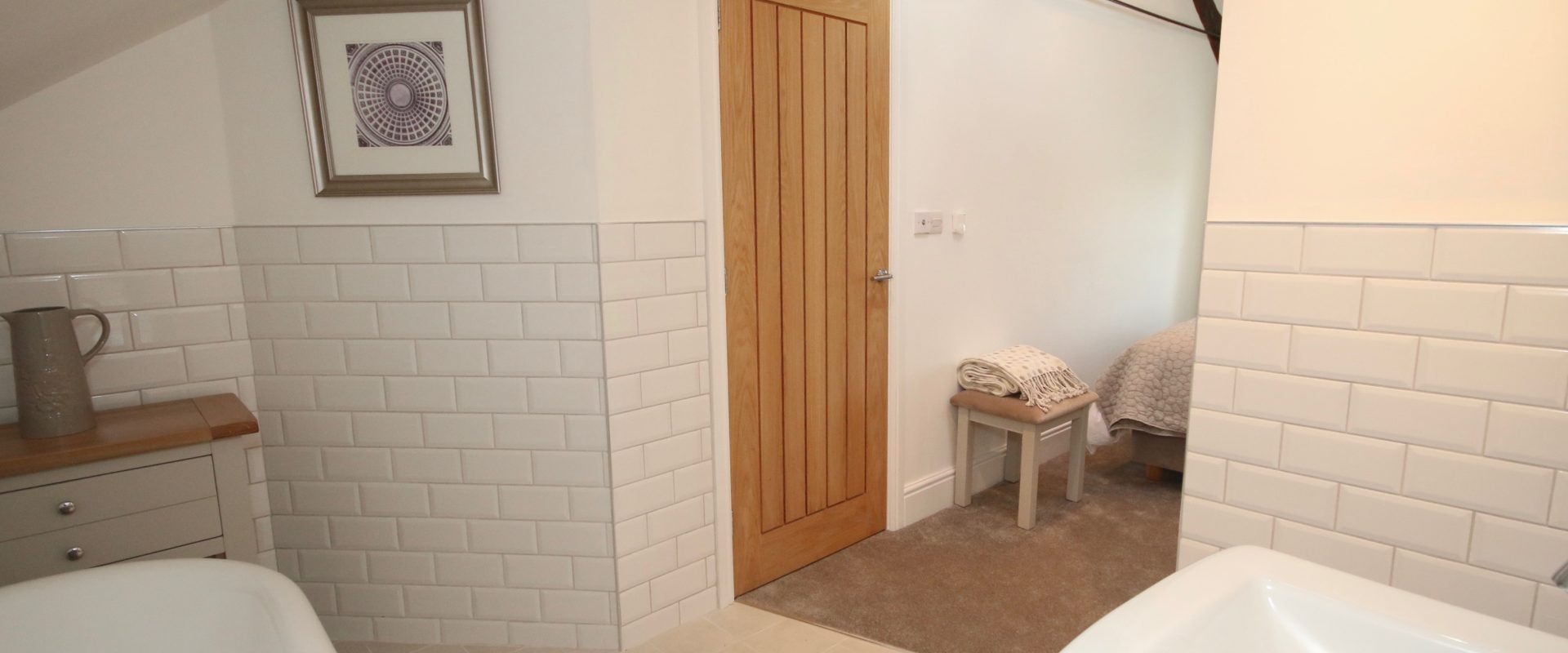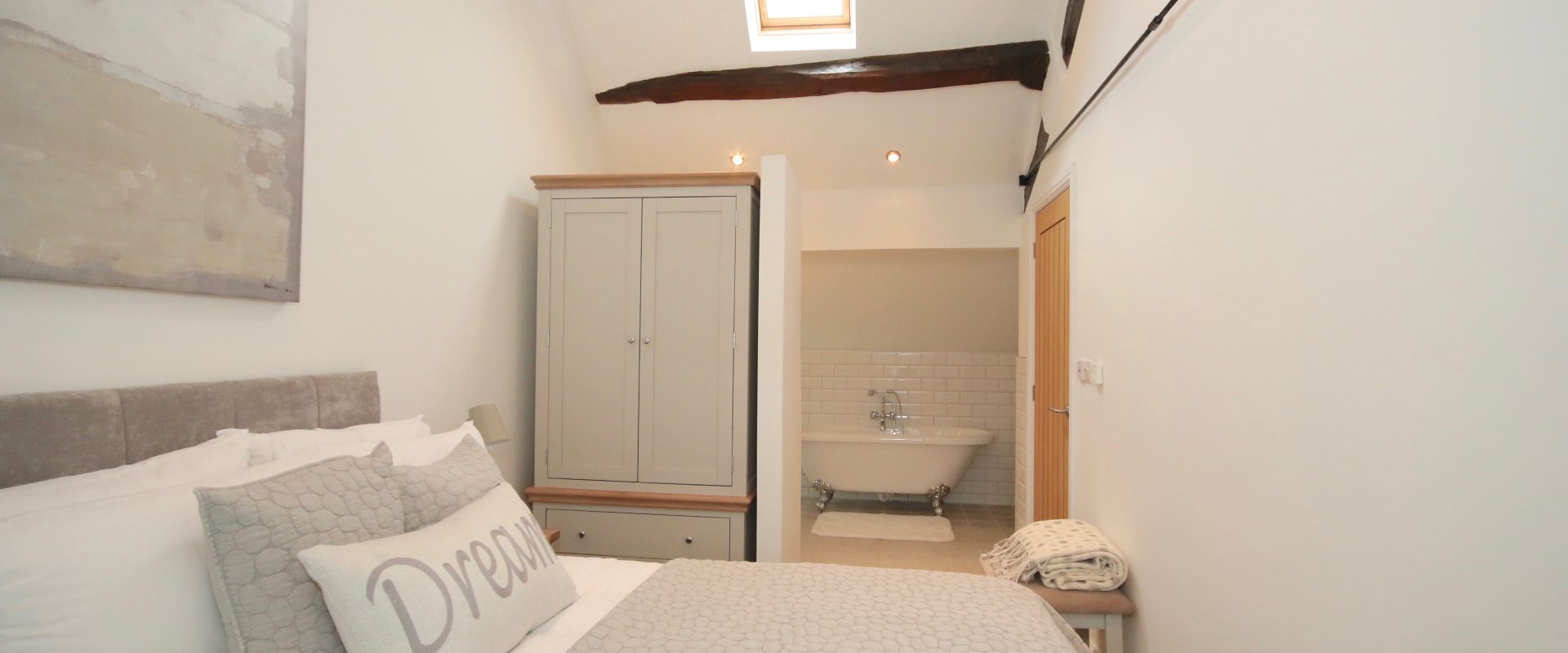 Ascending the spiral staircase to the first floor, you'll find two double bedrooms. The en-suite bathroom boasts a large free-standing bath, wash basin, and toilet, while the second bathroom offers a spacious walk-in shower.