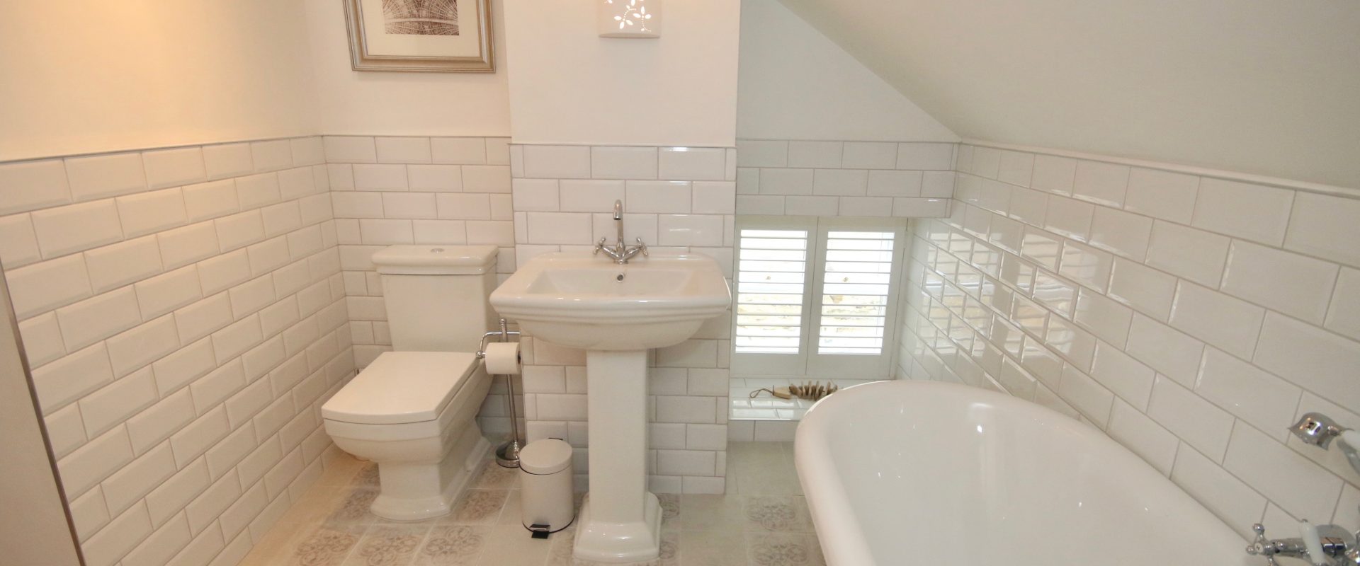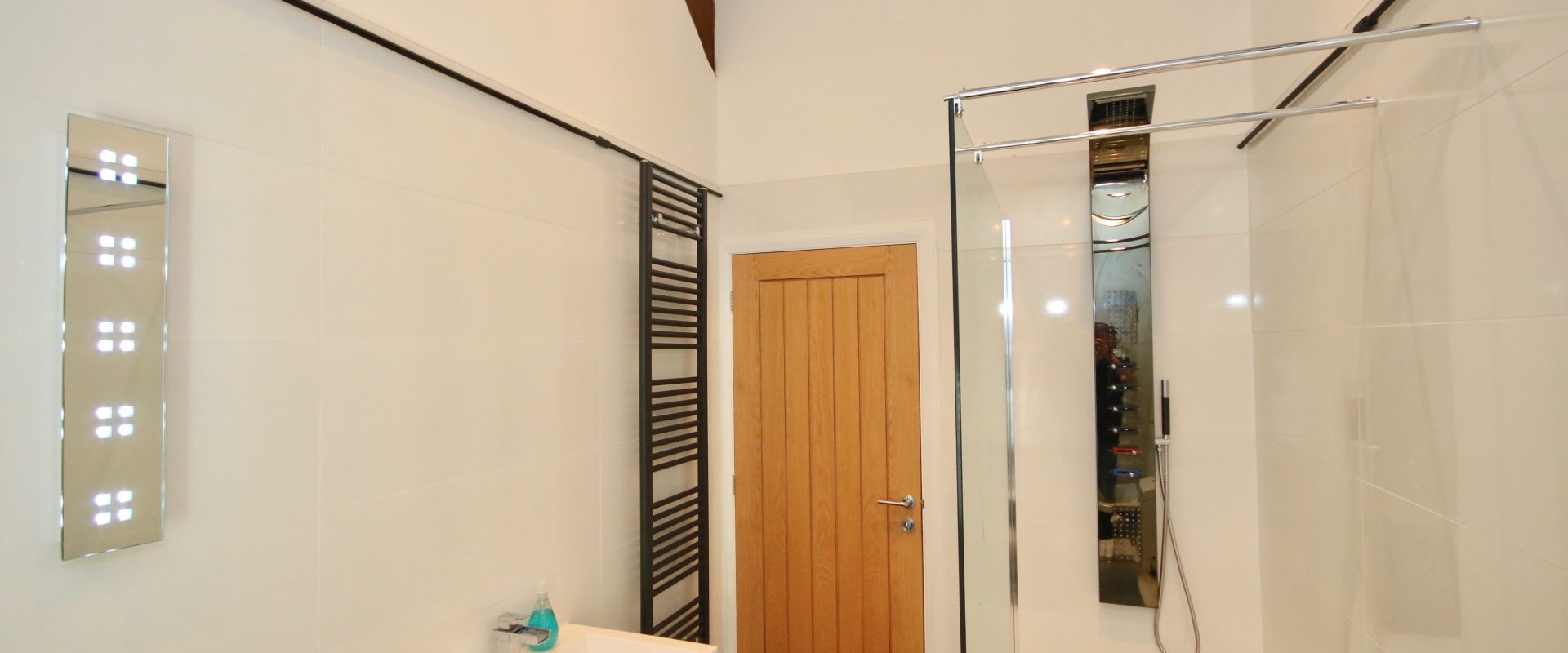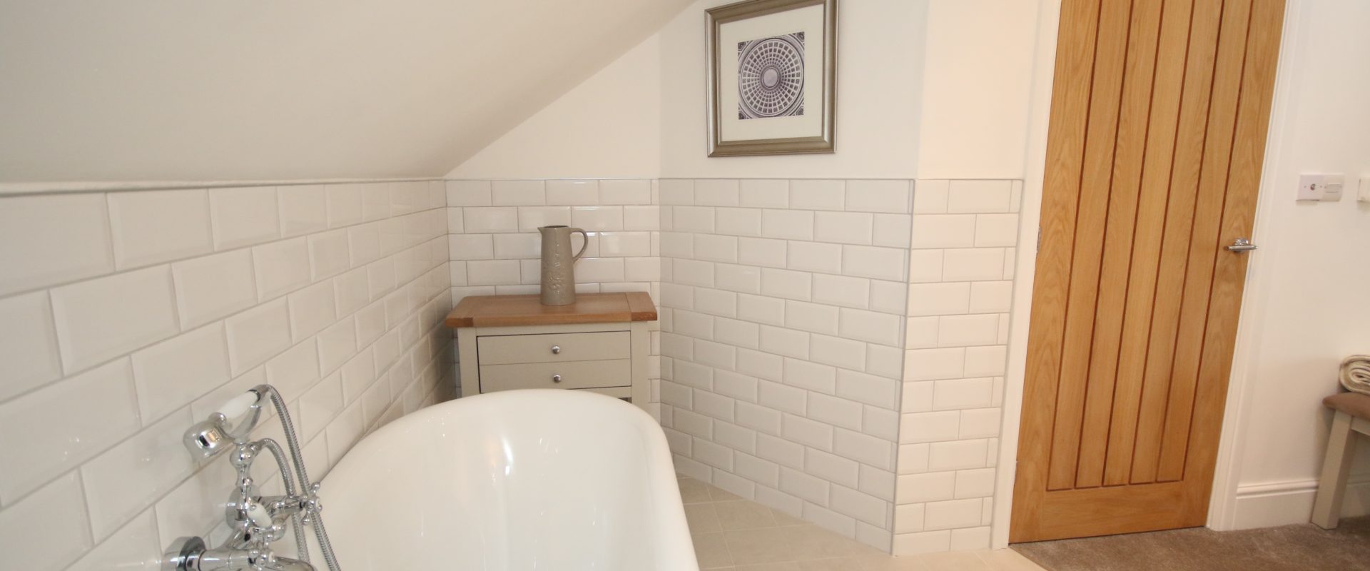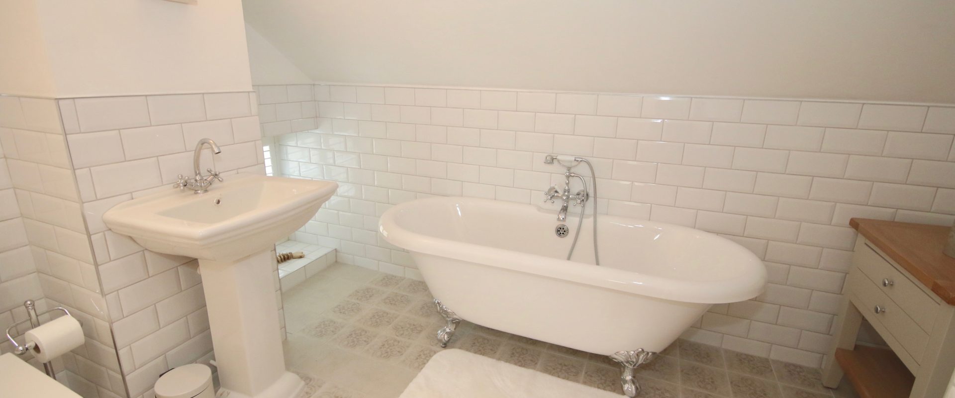 Ascending the spiral staircase to the first floor, you'll find two double bedrooms. The en-suite bathroom boasts a large free-standing bath, wash basin, and toilet, while the second bathroom offers a spacious walk-in shower.