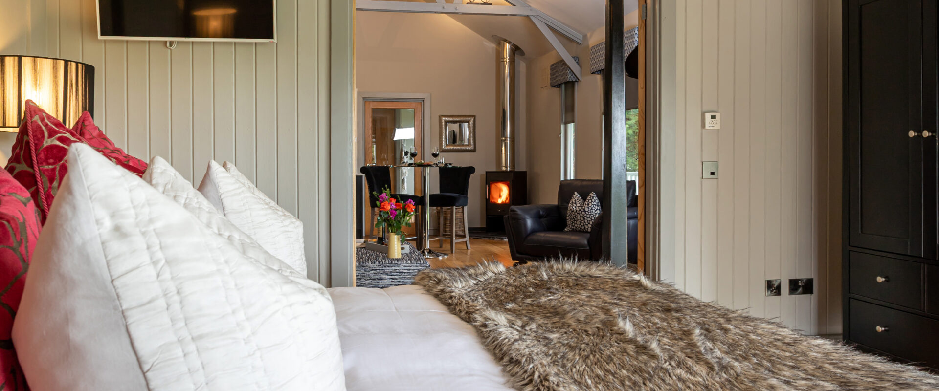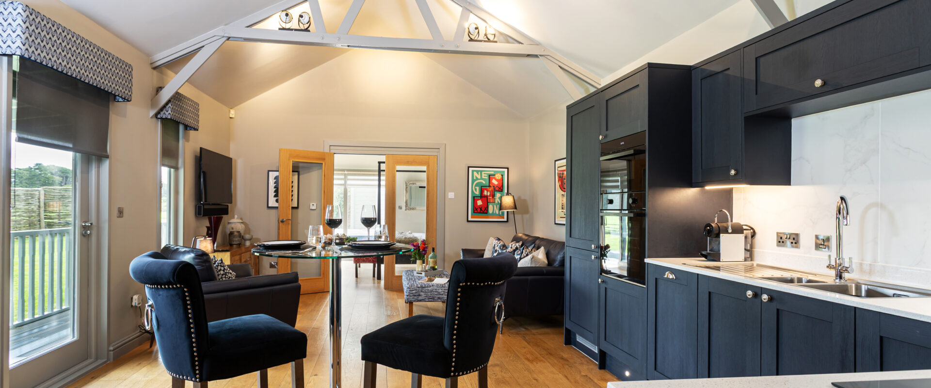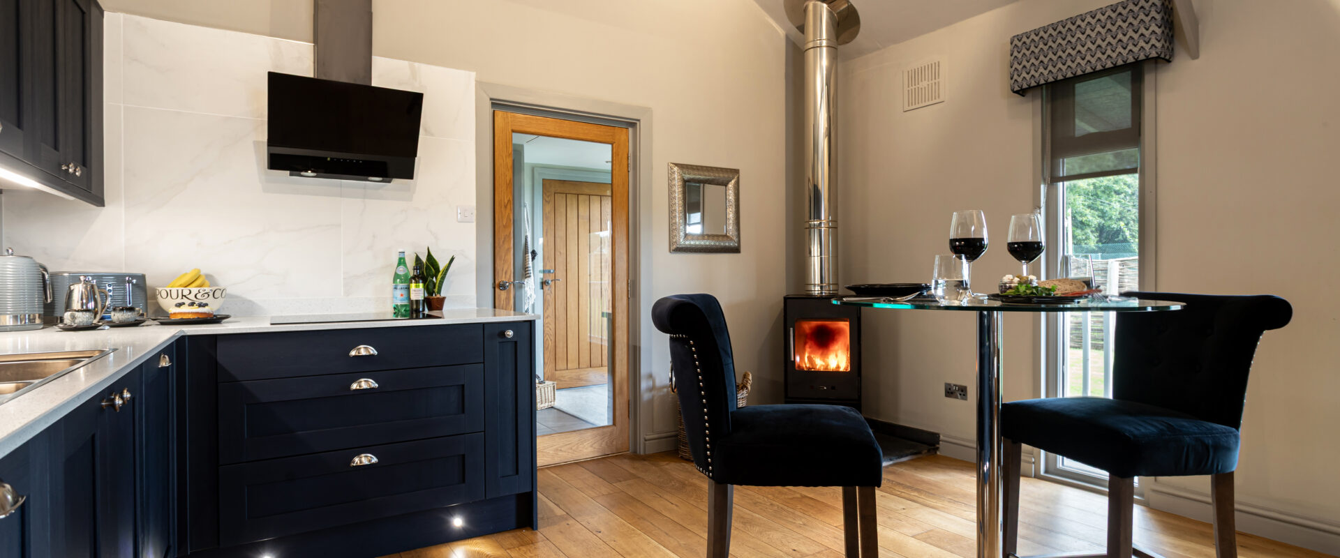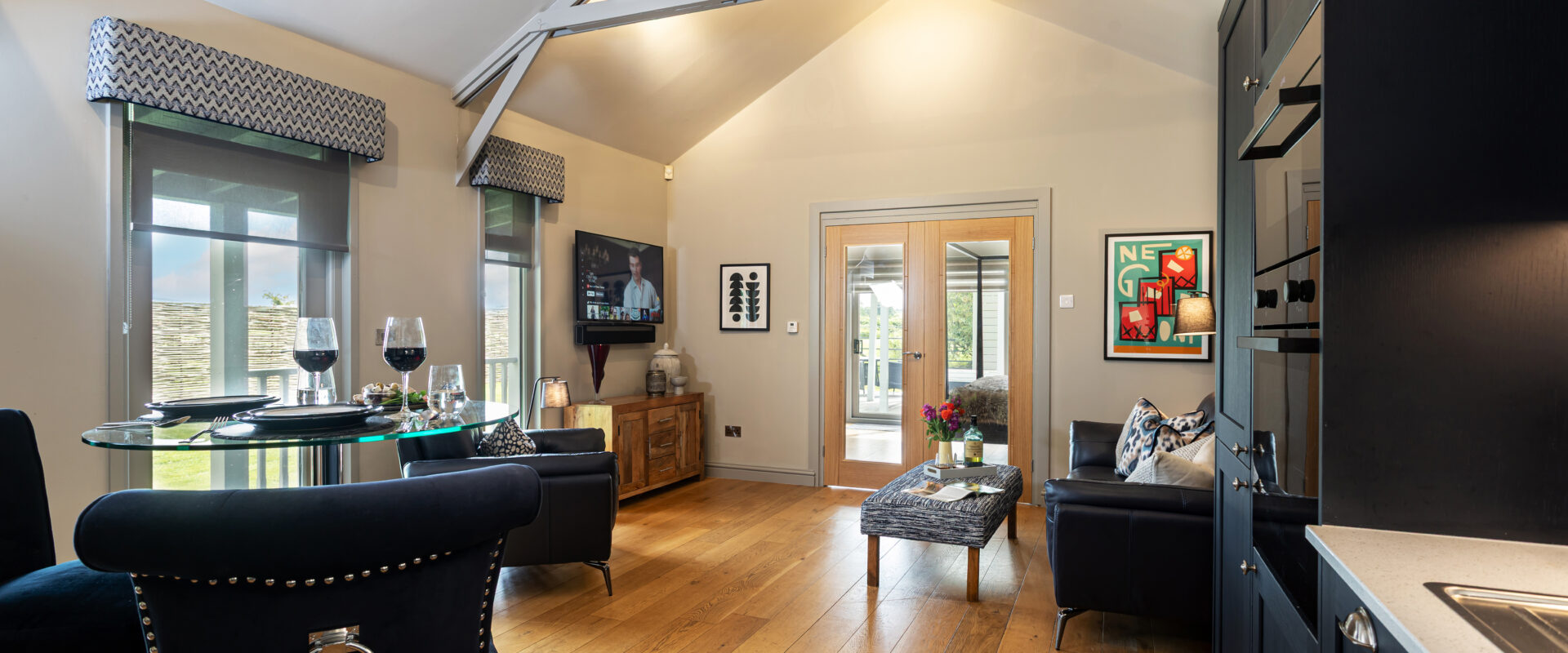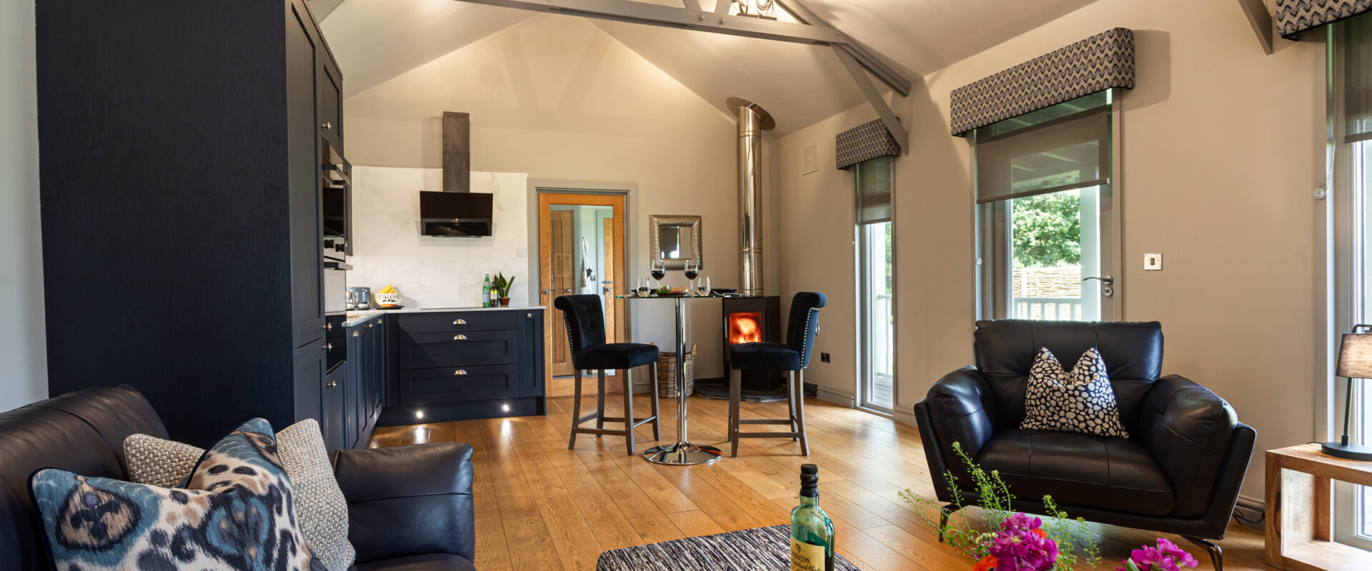 Stepping inside, you’ll be greeted by stylish, thoughtfully curated interiors that strike the perfect balance between comfort and elegance. The open-plan living space includes a fully equipped kitchen, dining area, and lounge, all designed to make you feel instantly at home. After a day exploring the surrounding countryside, sink into the hot tub under the stars or curl up by the fire with a glass of wine and your favourite show on the smart TV.
